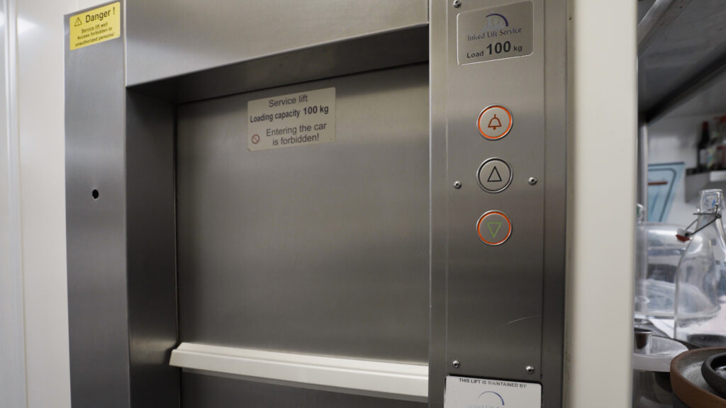 With a specific need to bridge the small underground kitchen prep area and the compact service area, INO required an equally compact yet efficient dumbwaiter. The available space for the lift posed constraints, requiring a lift to fit precisely within an 800mm x 650mm shaft with a limited internal car depth of 400mm.
